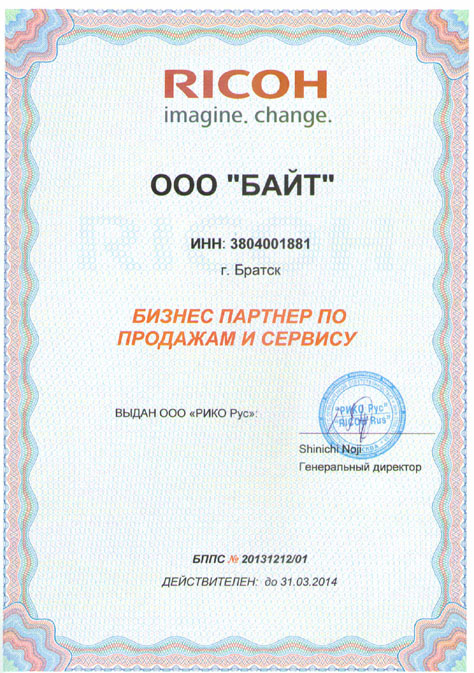 • Сертификат Бизнес Партнер по продажам и сервису Ricoh